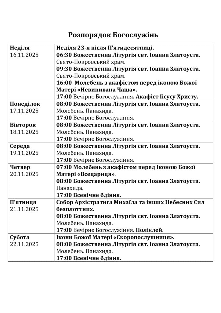 РОЗПОРЯДОК БОГОСЛУЖІНЬ 16-22.11.2025 р.